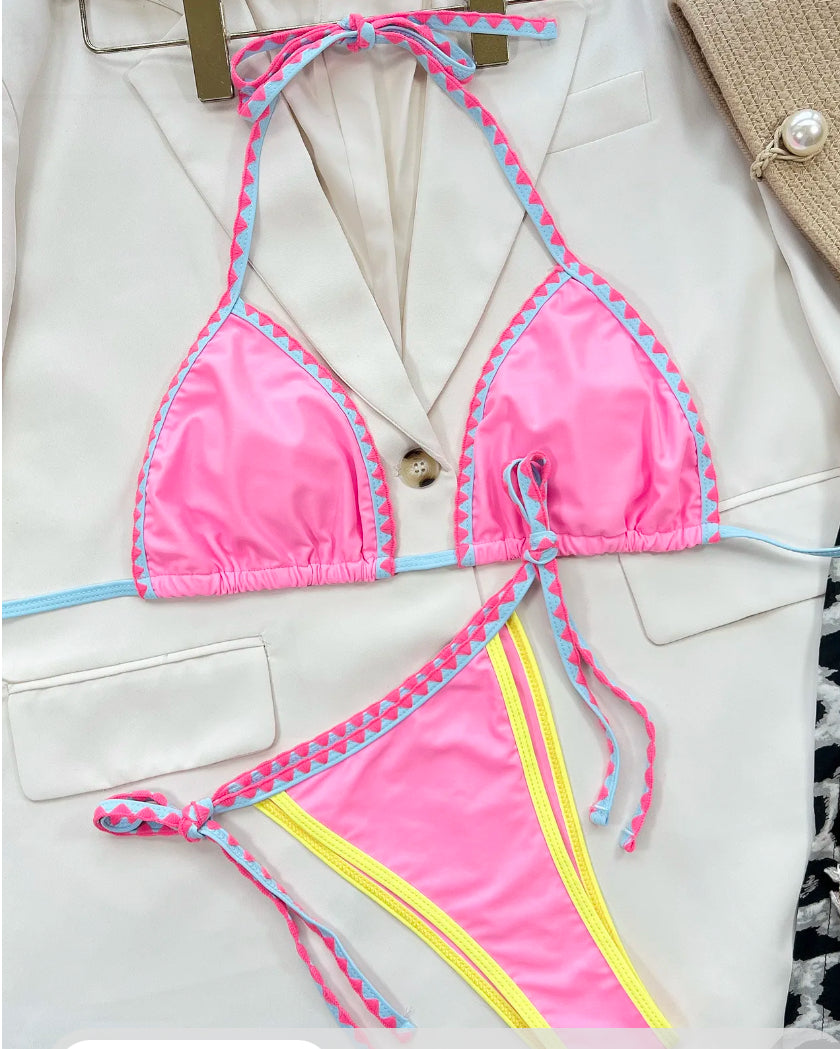 This bathing suit from Preppy Essentials features a bright pink base with bold yellow lines and contrasting blue straps on the back. The vibrant colors and modern design make it perfect for a stylish summer look.